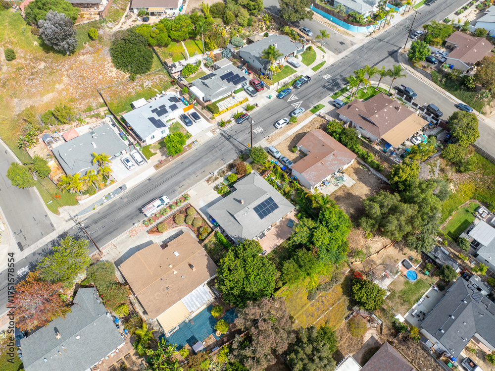 Aerial view of middle class houses in the valley of Oceanside town in San Diego, California. USA.