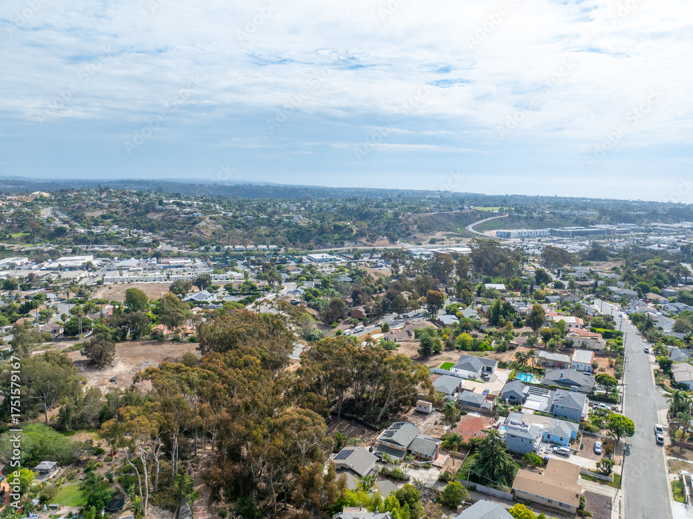 Aerial view of middle class houses in the valley of Oceanside town in San Diego, California. USA.