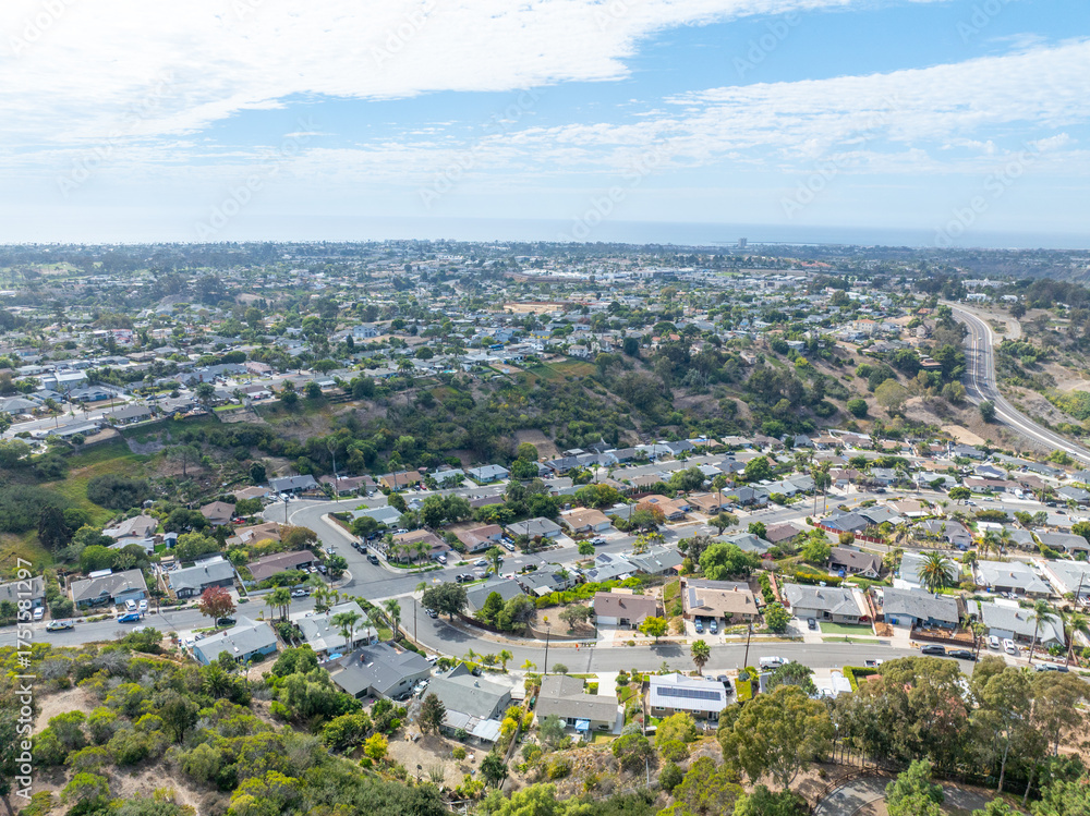 Aerial view of middle class houses in the valley of Oceanside town in San Diego, California. USA.