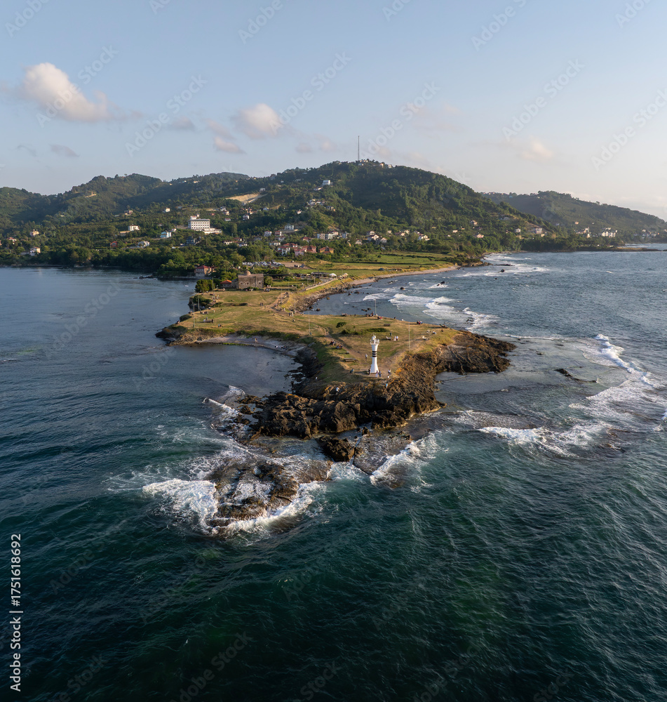 Aerial drone panorama landscape of Yason Burnu (aka Cape Yason) and its lighthouse. Located at Persembe, Ordu, Black Sea region of Turkey