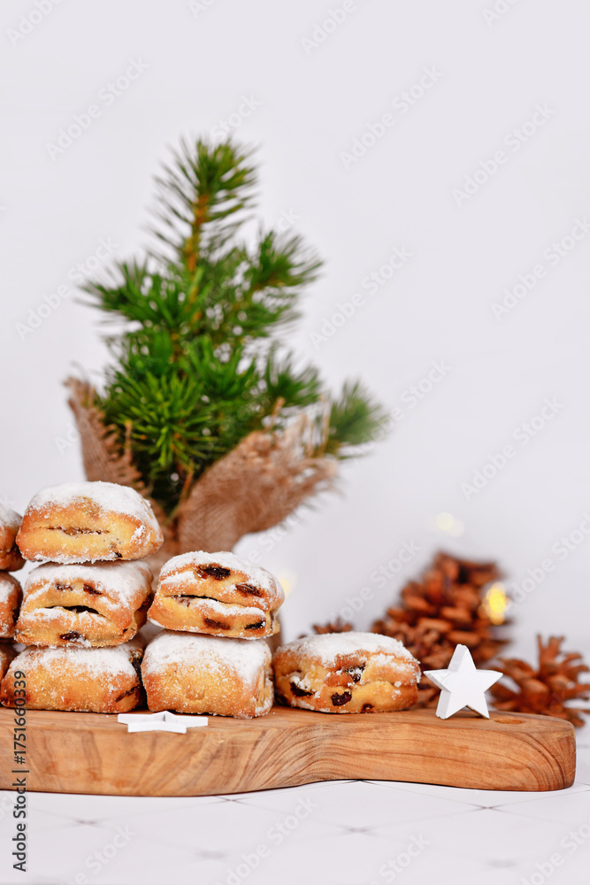 Small German Stollen cake pieces, a fruit bread with nuts, spices, and dried fruits with powdered sugar traditionally served during Christmas time