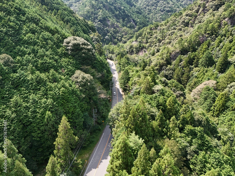 A road winds through a forest with trees on both sides. The road is narrow and winding, and there are no cars on it. The trees are lush and green, and the sky is clear