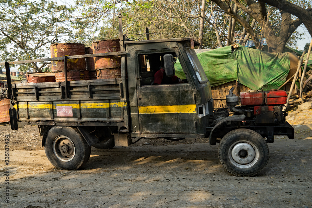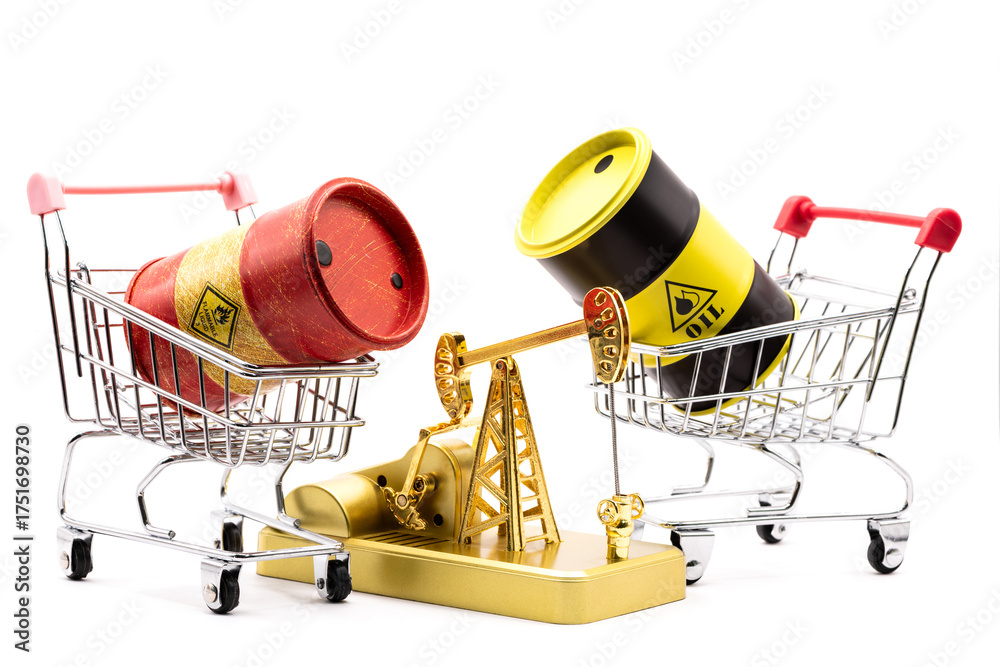 Miniature golden oil pump and iron oil barrel in a supermarket shopping cart on a white background