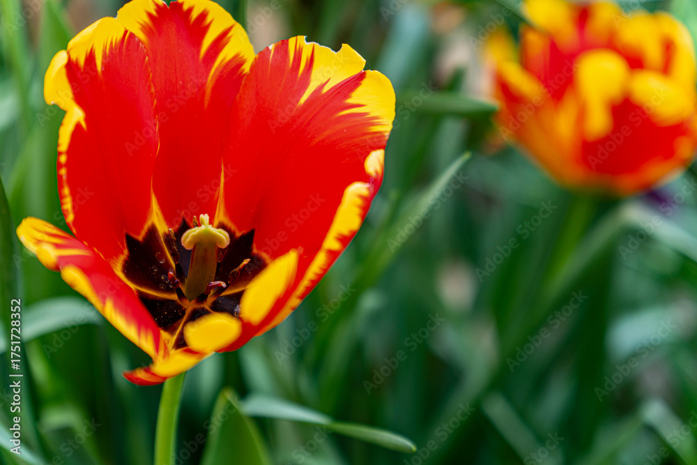 Close-Up of Red and Yellow Tulip Blooming in Spring
