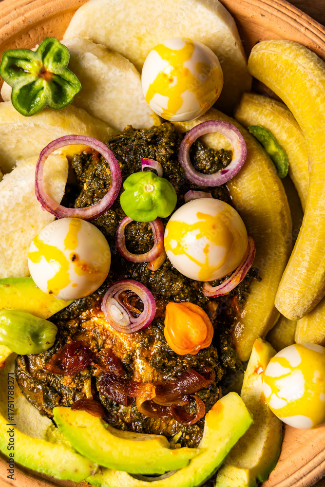 Ampesie, Traditional Ghanaian Dish of Boiled Yam and Plantain Served with Kontomire Cocoyam Leaves Stew, Avocado, and Eggs, Popular Meal from West Africa.