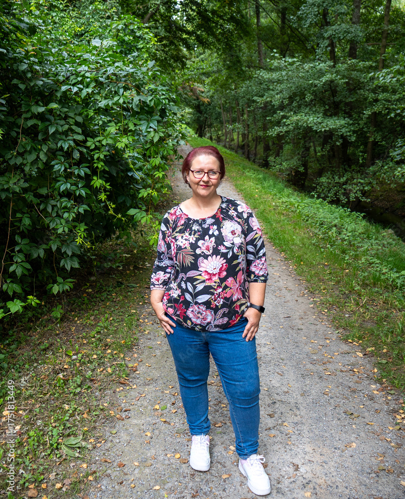 Casual portrait of a woman in jeans and a floral blouse on a forest path
