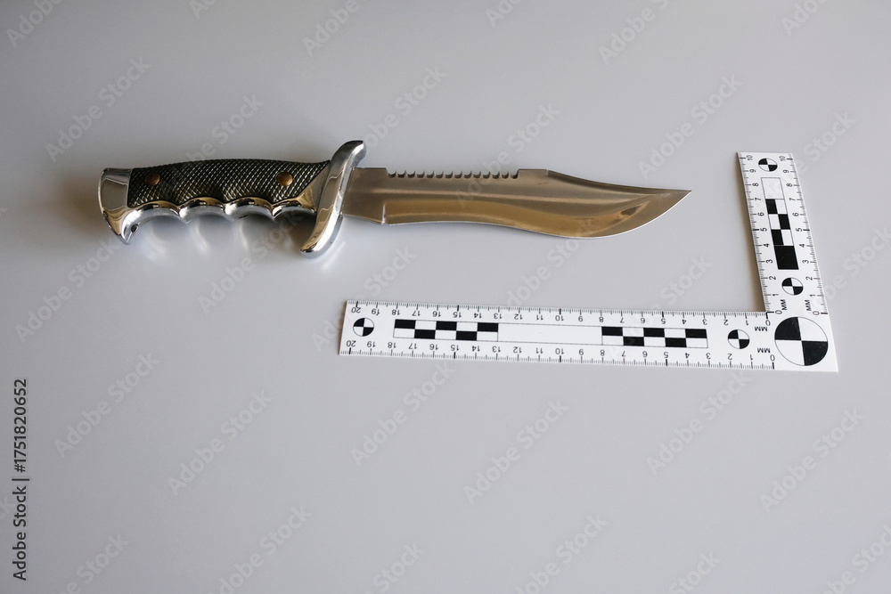 Forensic analysis of bladed weapons, knife with scale ruler on gray background. Evidence examination in police forensic laboratory.