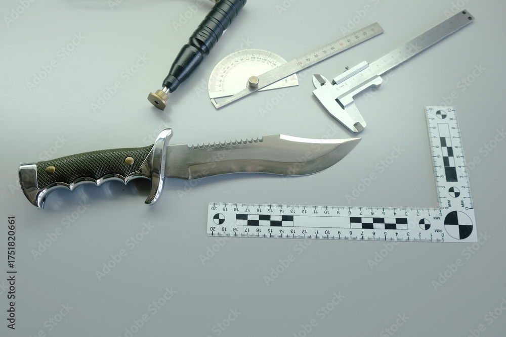 Forensic analysis of bladed weapons, knife with scale ruler on gray background. Evidence examination in police forensic laboratory.