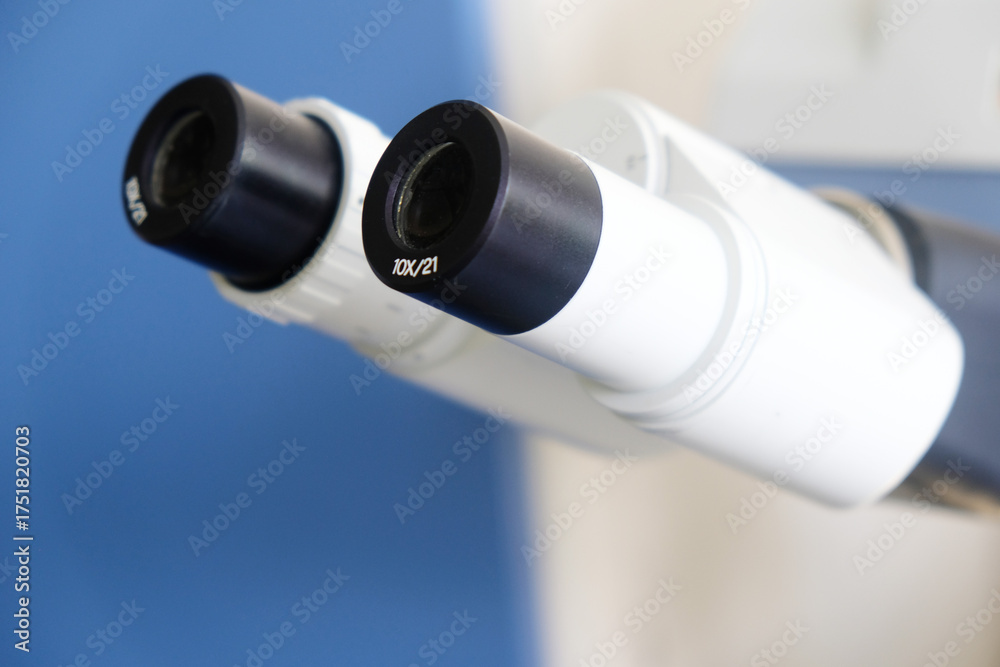 Close-up of the eyepiece of a medical microscope in a laboratory