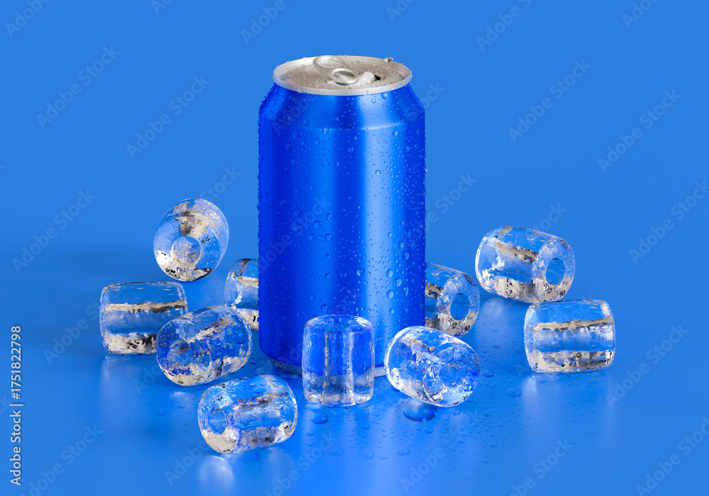 Open Blue Refreshing canned drink, and ice cubes on blue background
