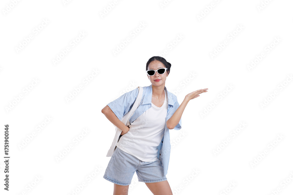 Confident Traveler: A stylish individual in sunglasses, casually dressed, extends a welcoming hand, exuding an aura of travel and exploration, inviting you to journey along.