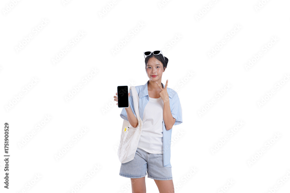 Smartphone Show and Joyful Expression: A cheerful person, showcasing a smartphone with a blank screen, flashes a victory sign, conveying a sense of delight and approval.