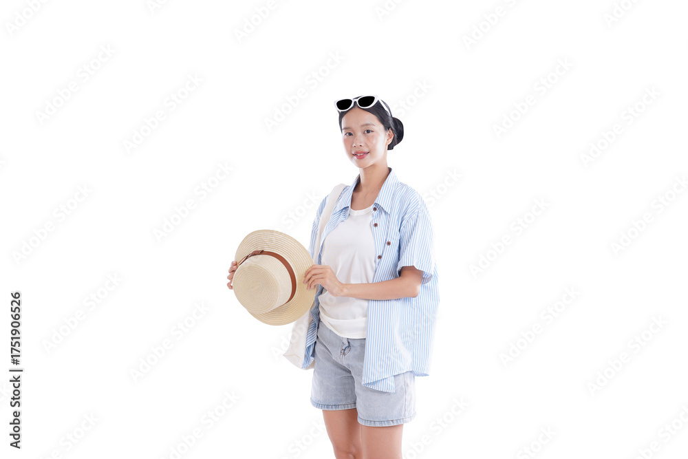 The Traveler's Serenity: A woman, prepared for adventure, holding a sunhat, exudes the promise of travel, embodying a moment of joyful anticipation and a spirit of wanderlust.