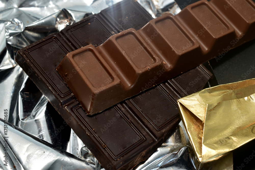 Dark chocolate and filled chocolate bar in packaging on black background.