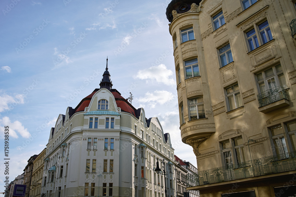 Street view of historic buildings with decorative facades, bay windows and red tiled roofs in Prague, Czech Republic