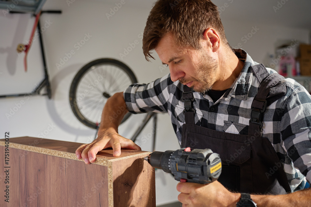 Close-up of carpenter drilling hole in wooden furniture panel with electric drill. Man in work overalls working at home workshop. Concept of woodworking and furniture making