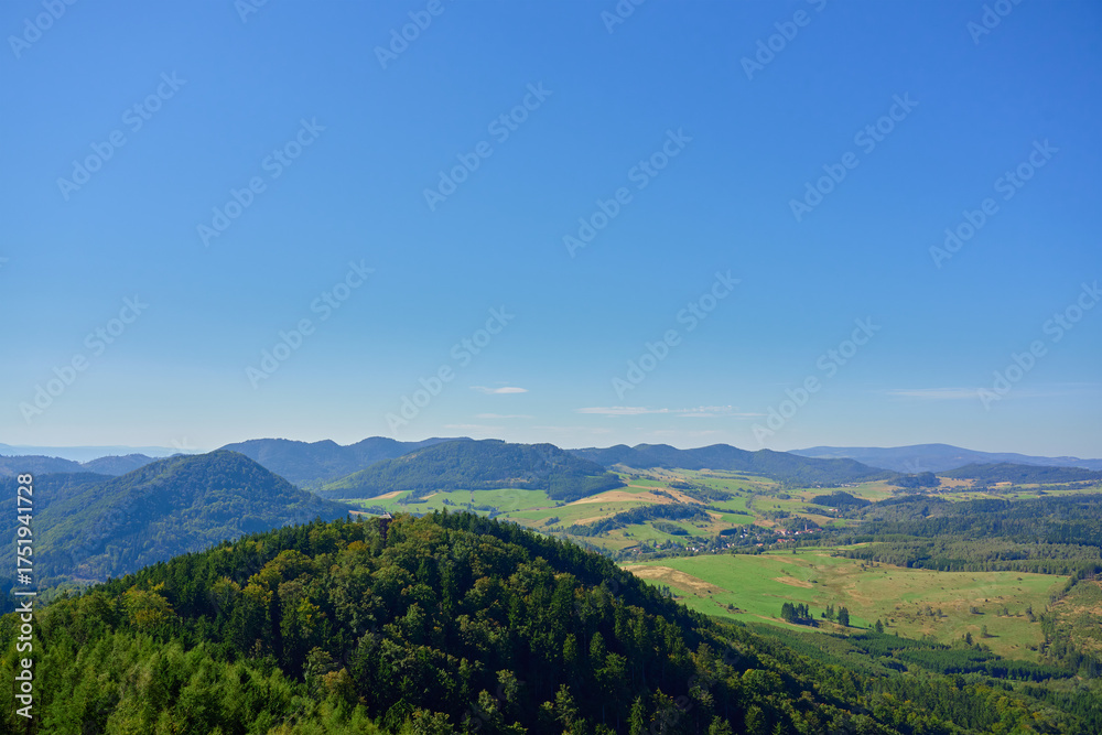 Wide panoramic view of green valley and forested mountain hills under blue summer sky. Beautiful natural landscape