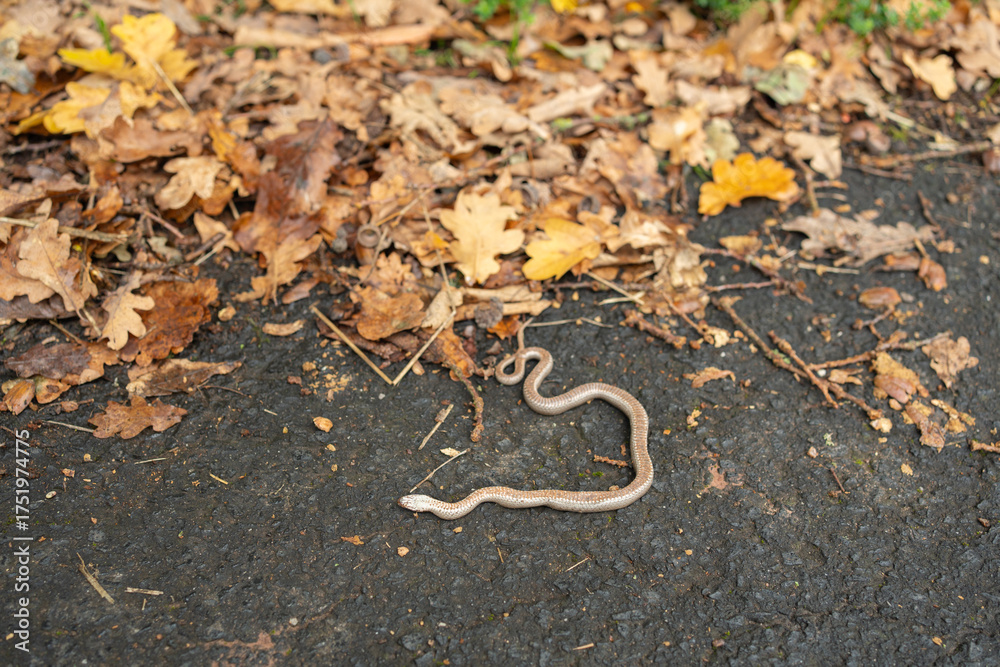 Small brown snake lying on dark road surface, autumn wildlife photography close-up