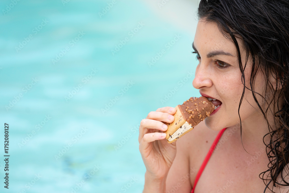 Woman enjoying a refreshing ice cream sandwich while relaxing poolside on a summer day