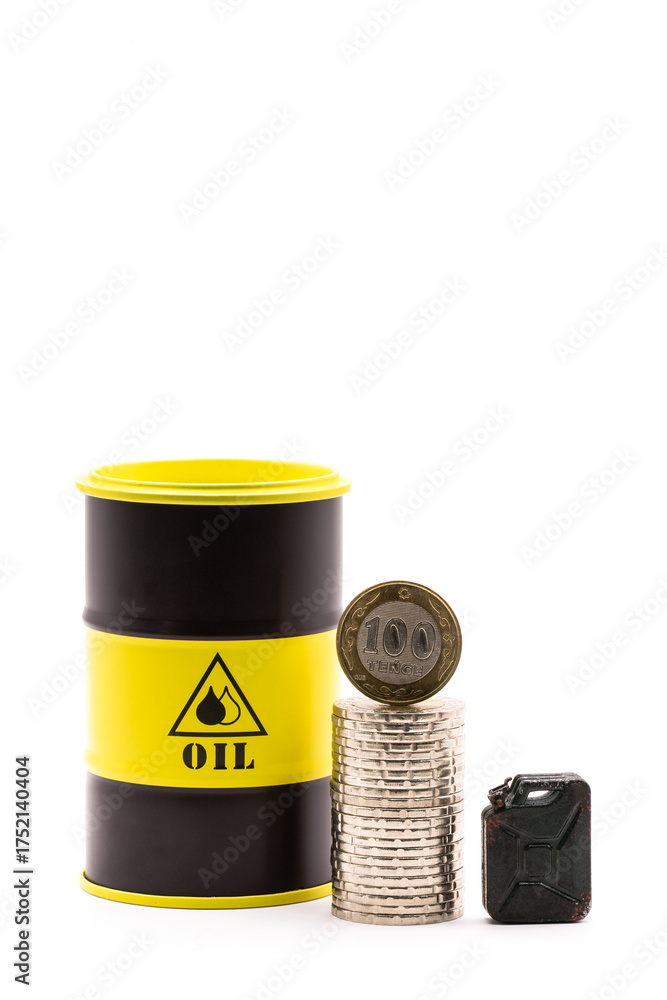 A 100 Kazakhstani tenge coin, a gasoline canister, and an iron oil barrel on a white background