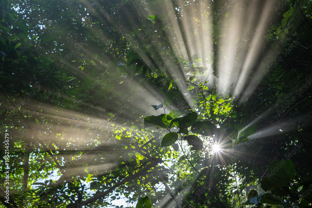 Sunlight rays shining through green forest leaves in tropical jungle