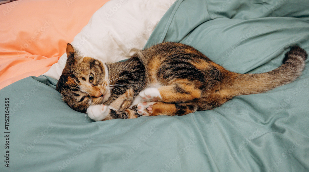 A tricolor cat is lying on the bed and viciously pulling a toy with its paws