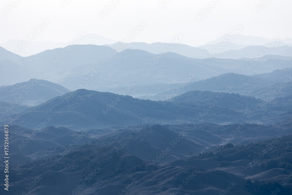 Silhouettes of forested mountain ridges disappearing in morning haze, Durmitor, Montenegro