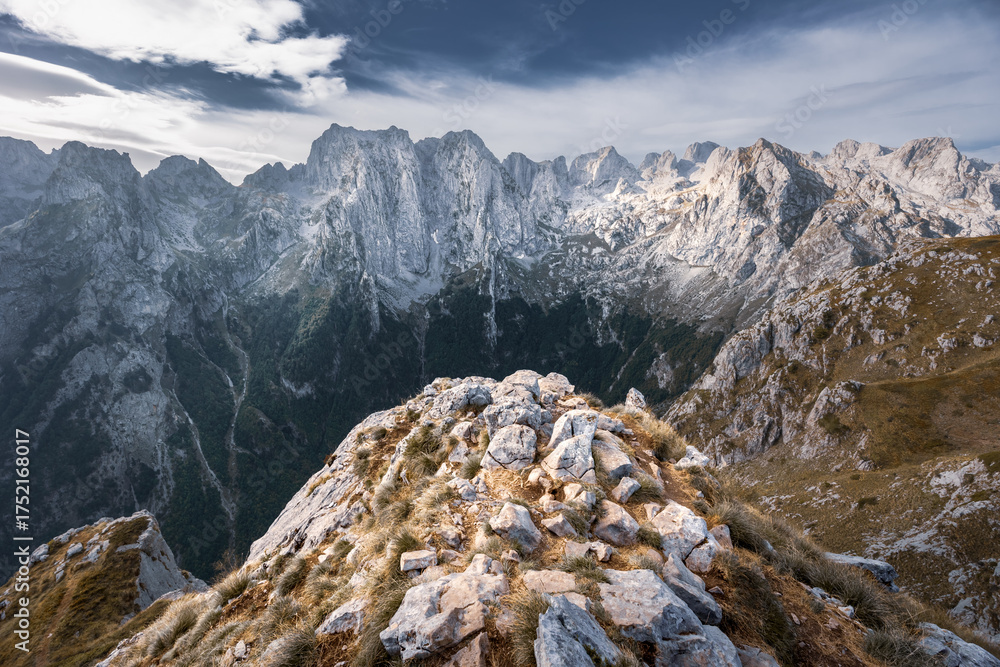 Sunlit hilltop with view to rocky mountain ridge on sunny day, Prokletije, Montenegro