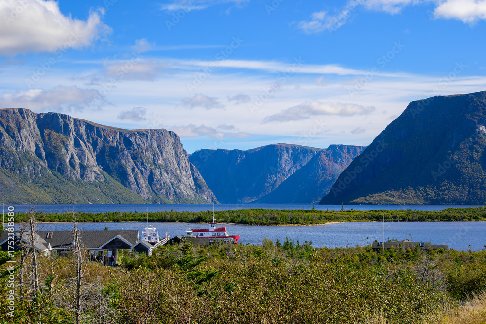 Tour boat facility on Western Brook Pond in Gros Mourne National Park Newfoundland with the dramatic cliffs that form the famous fjord in background blue sky room for text