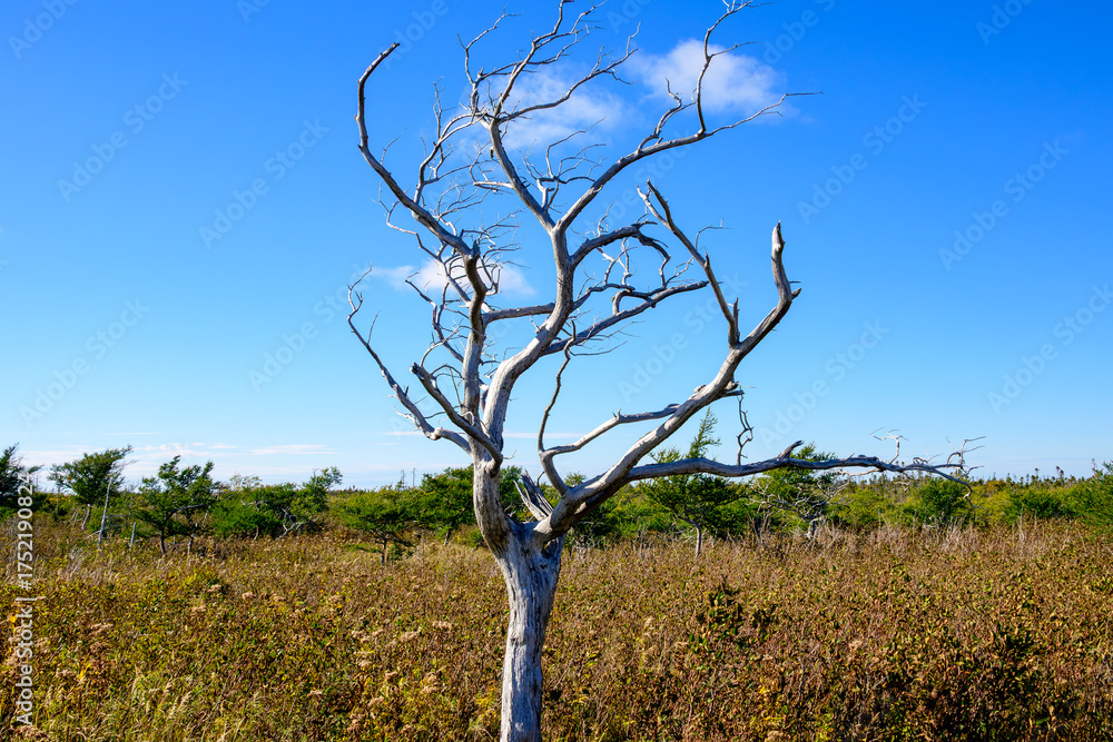 Lonely tree with bare dead branches, bog and heath vegetation in background, shot near Western Brook Pond in Gros Mourtne National Park Newfoundland room for text suitable as backdrop