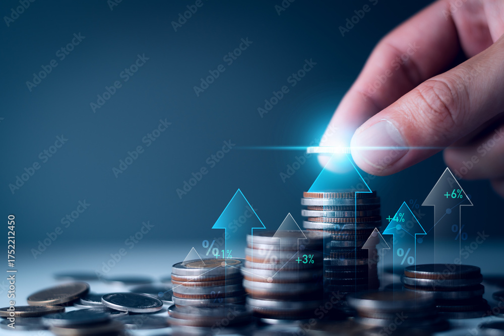 Save money for investment concept, Stack of coins with trading chart in financial, stock market, wealth economy, interest rate, Inflation and tax.