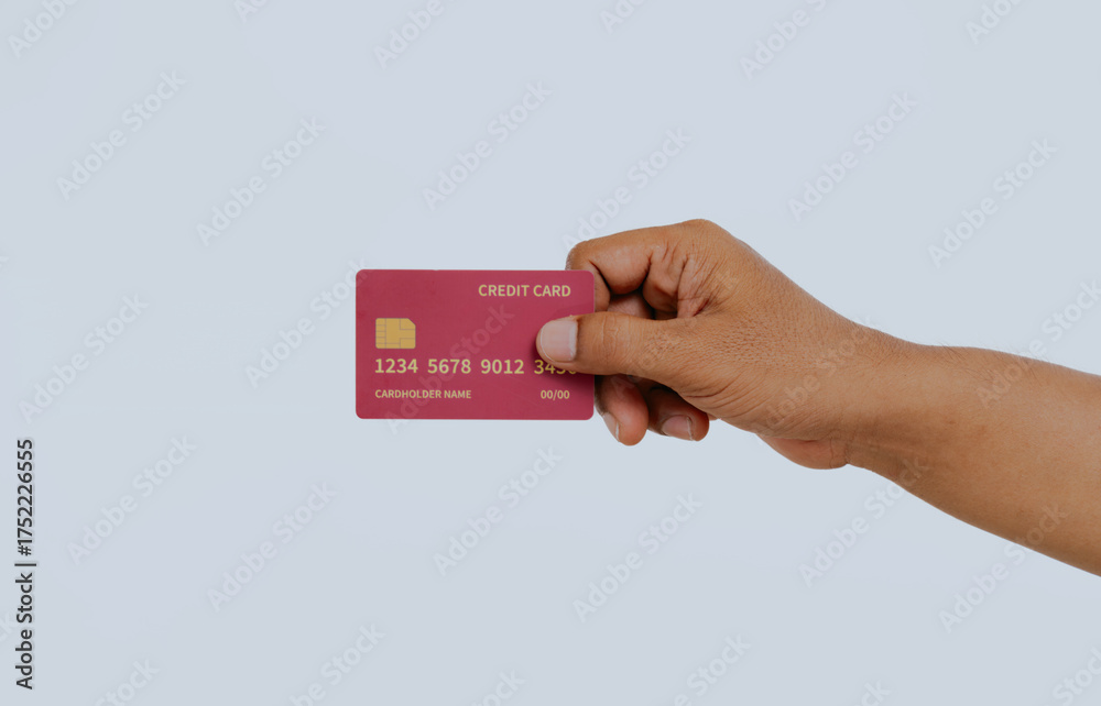 Hand showing a red credit card, business card or voucher, template mock up, isolated over white background.