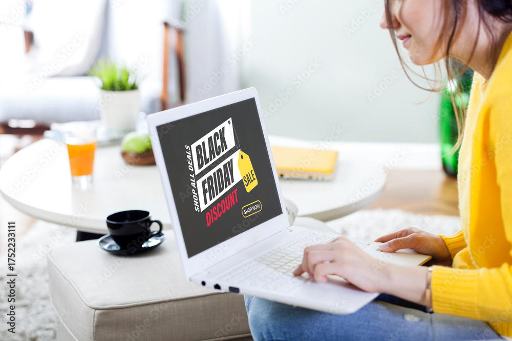 Cozy home shopping with laptop displaying Black Friday discount Promo and credit card