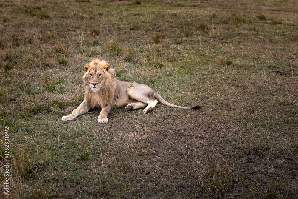 A beautiful lion in the African savannah. A large lion. African nature. Wild animal.