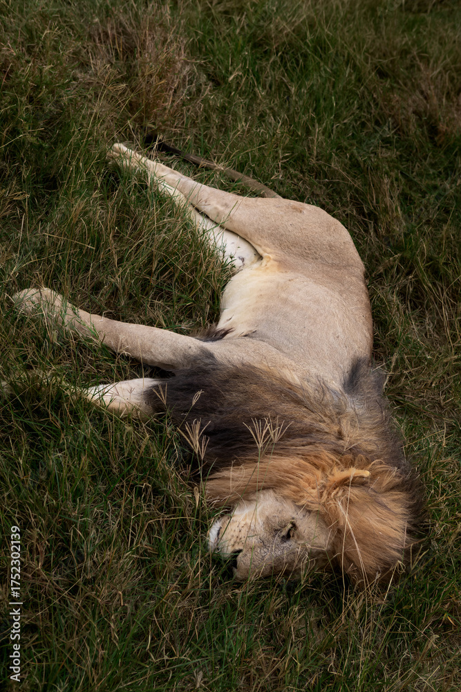 A beautiful lion in the African savannah. A large lion. African nature. Wild animal.