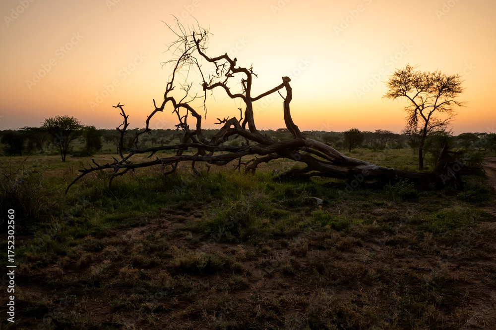 A beautiful and colorful sunrise in the African savannah. A play of light and shadow. A beautiful sky.