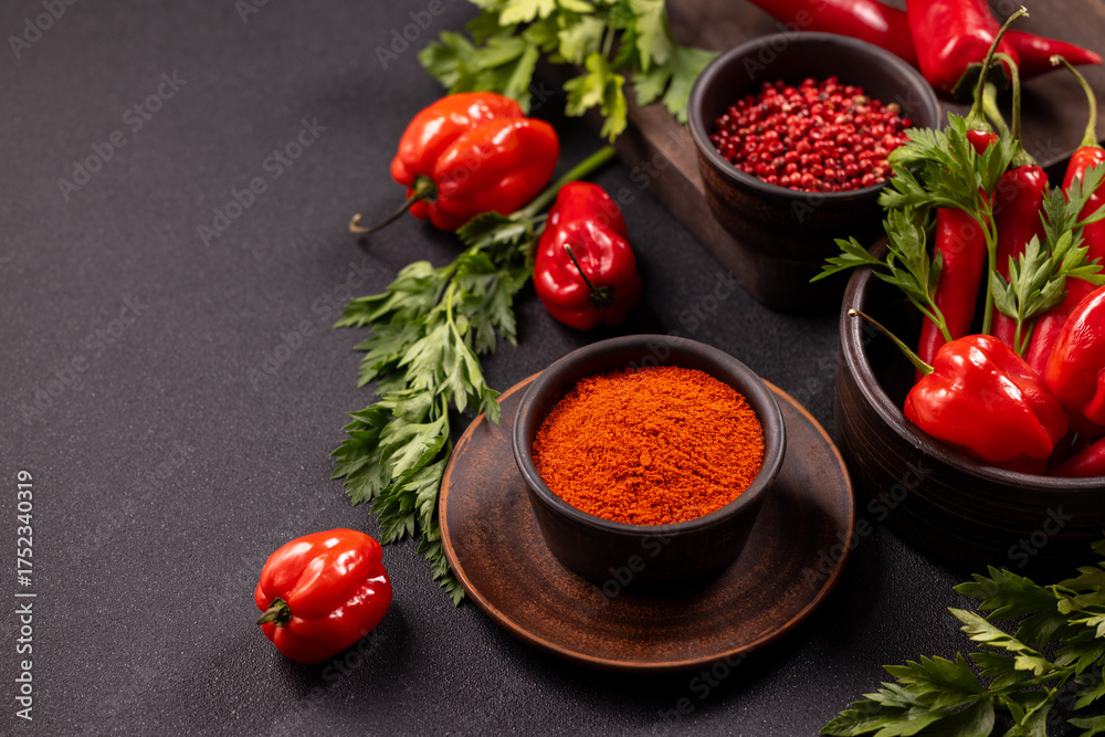 Spicy chili peppers, paprika, and pink peppercorn spices
