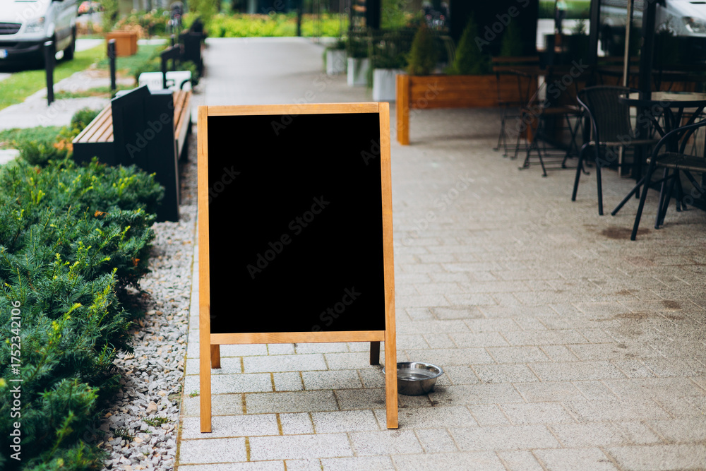Restaurant sidewalk chalkboard sign board. Old Black Signboard on the street. Blank store signage sign design mockup isolated