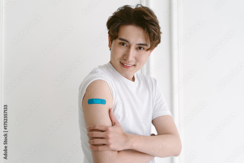 Asian young man smiles confidently while showing his arm with a blue bandage after vaccination. The image conveys health awareness, safety, and encouragement for self-care and immunization.