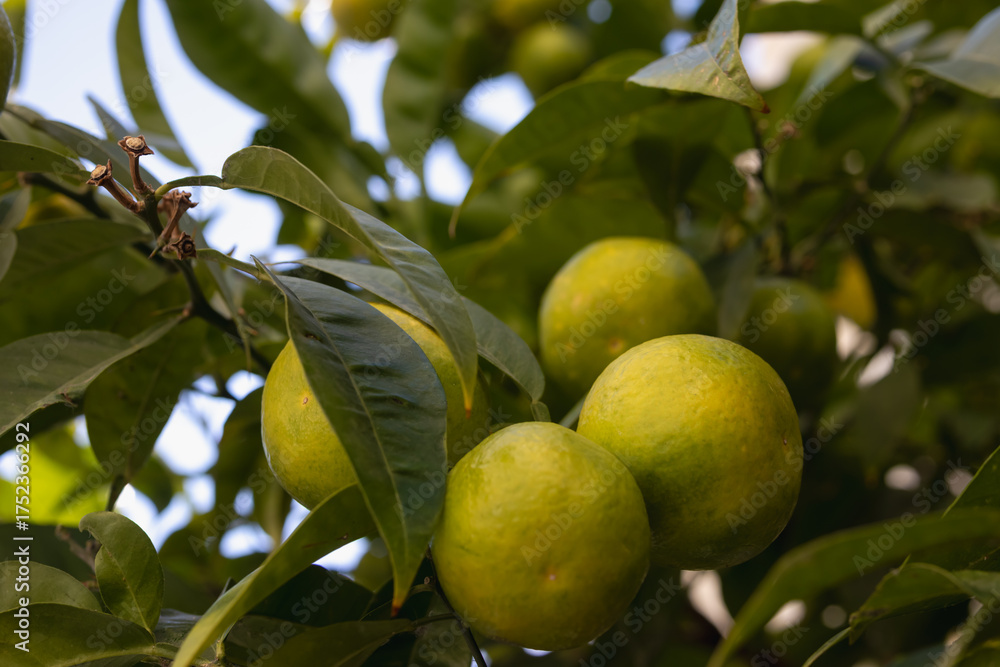 unripe citrus fruits, possibly green oranges or limes, hanging amongst lush green leaves on a sunlit tree branch, symbolizing freshness and growth