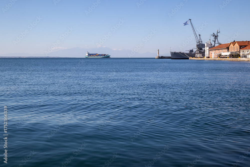 thessaloniki port view across the thermaic gulf to mount olympus in greece with a cargo ship and harbour crane under a clear blue sky