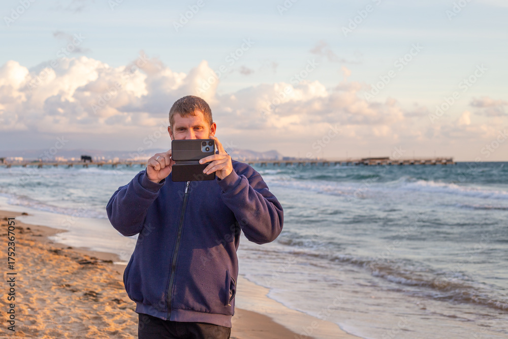 A man stands on a sandy beach, taking a photo of a picturesque ocean view on his phone under a bright cloudy sky