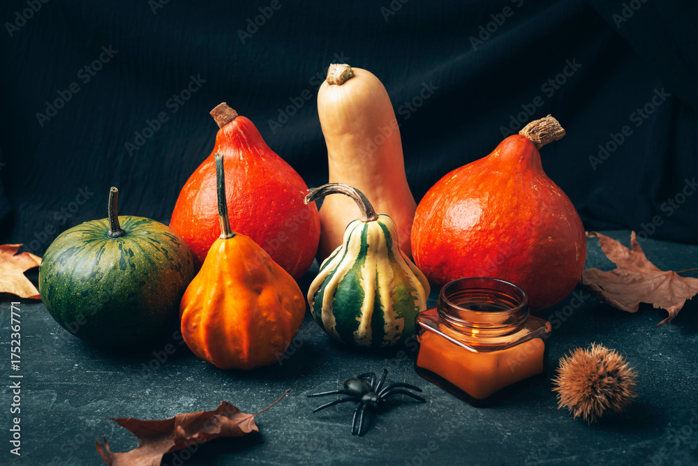 Various pumpkins, fallen leaves, candle and spider on black background. Halloween concept. Closeup