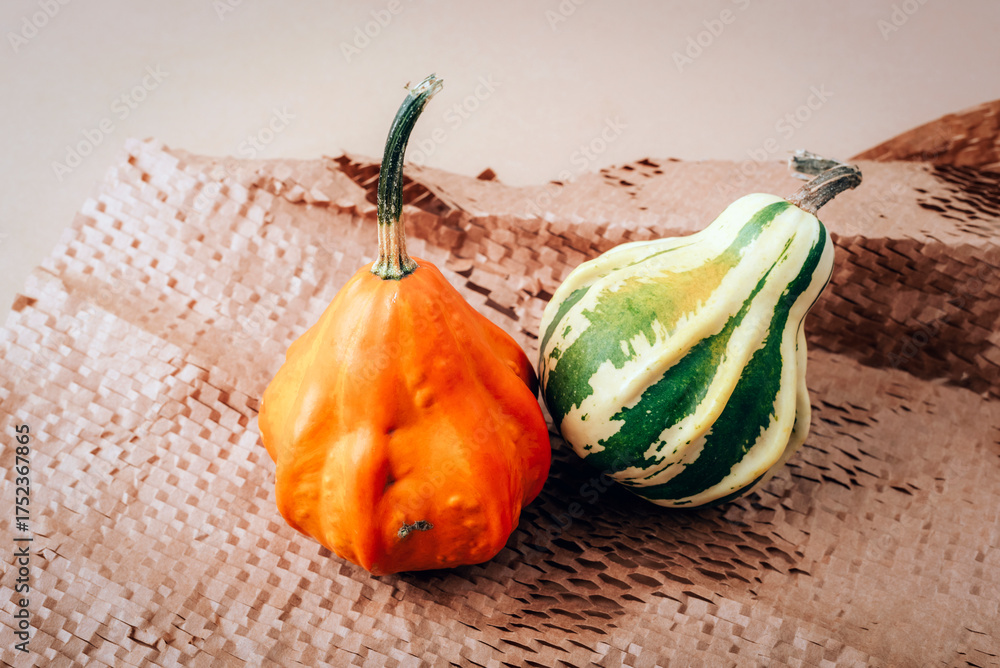 Two decorative multi-colored pumpkins on a craft paper background. Autumn holidays, Halloween, Thanksgiving concept. Closeup