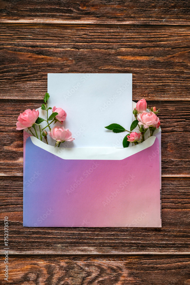 Rose flowers in craft envelope and white empty paper card on wooden background