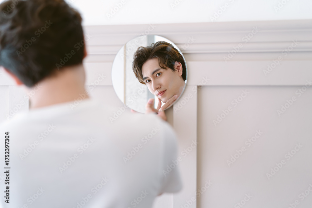 Asian man in a white t-shirt looks at his reflection in a round mirror, gently touching his face with a confident smile.conveys self-care, confidence, and grooming awareness in a bright at home.