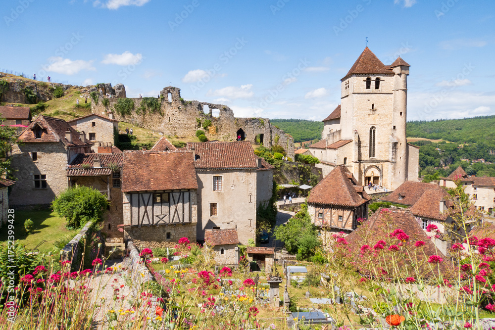 Photo of old cliffside village of Saint-Cirq-Lapopie in France, with vivid colors and light