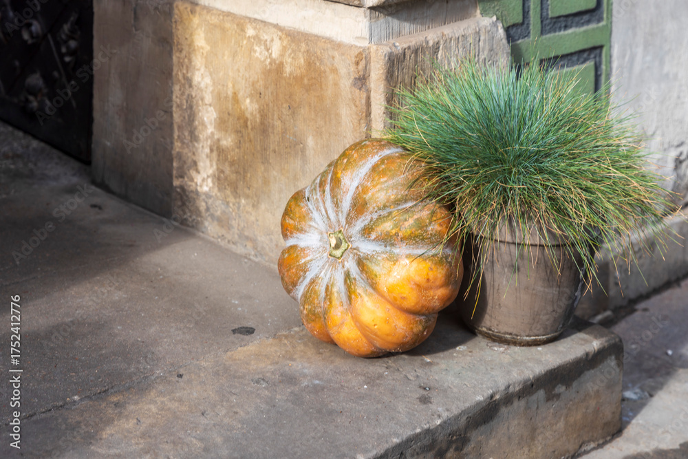 Autumn Display with Heirloom Pumpkin and Ornamental Grass in a Pot on Stone Steps