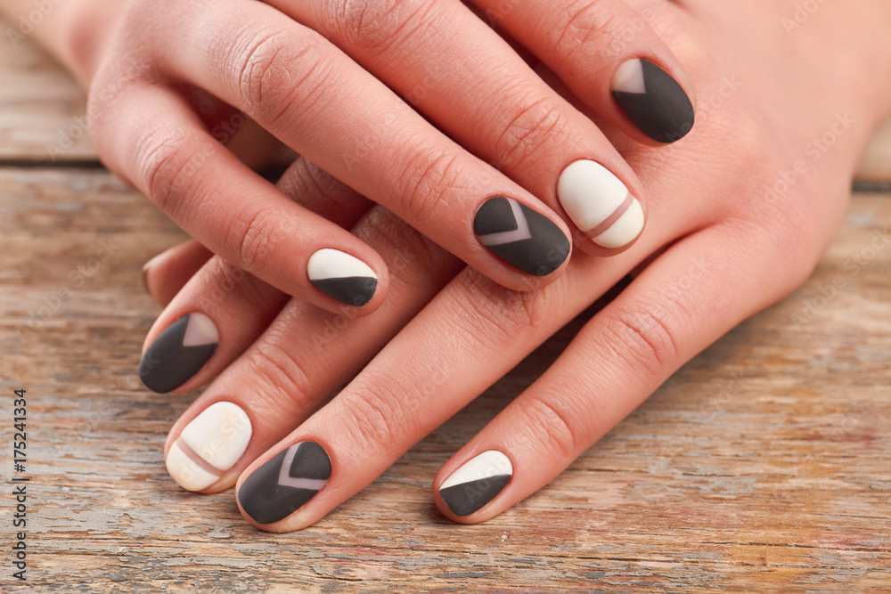 Female hands with stylish manicure. Woman hands with black and white matte manicure on old wooden background close up. Salon beauty and spa.