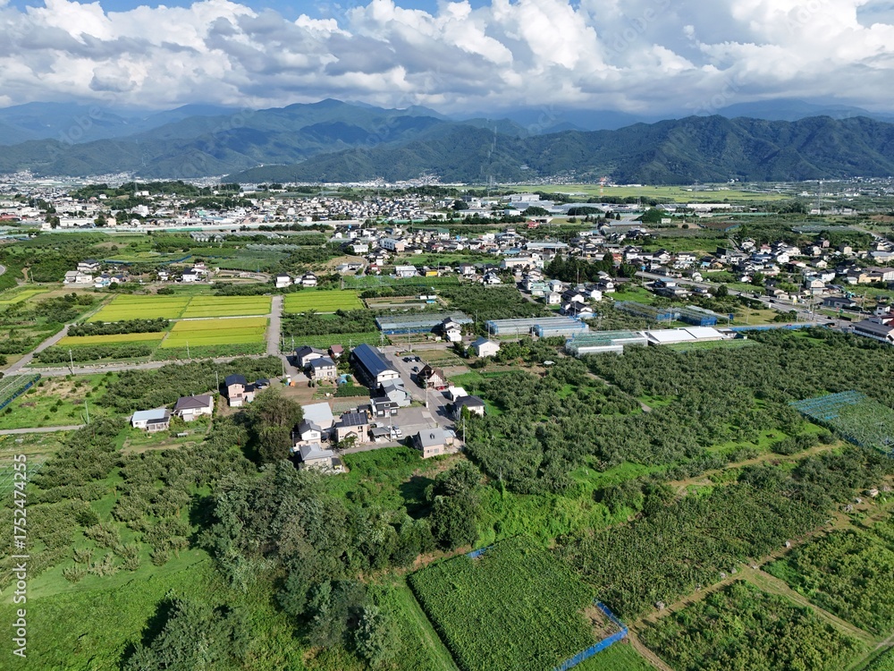 A lush green field with a small town in the background. The sky is cloudy and the mountains are visible in the distance